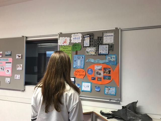 In einer Doppelstunde konnten sich die Gäste, d.h. die Schüler der Parallelkurse, nicht nur mit Hilfe der aufwändig gestalteten Wandtafeln informieren, sondern dabei auch selbst tätig werden. So gab es neben der Möglichkeit, sich am Tablet vertiefte Informationen zum Thema Energie zu beschaffen, auch Quizfragen, interaktive Poster, die Gelegenheit, seinen Carbon Footprint mit Hilfe eines originellen Quizzes mit dem anderer Schüler aus dem Jahrgang zu vergleichen oder verschiedenen Arten von Kunststoffgegenständen von der Windel bis zur Zigarettenkippe die Zeit für ihre Zersetzung zuzuordnen. Auch eine sich bereits in Mikroplastik zersetzende, in der Landschaft gefundene Plastikfolie zum Anfassen brachte den Schülerinnen und Schülern die Umweltproblematik nahe. Alle Stationen wurden den Gästen in der Fremdsprache präsentiert.