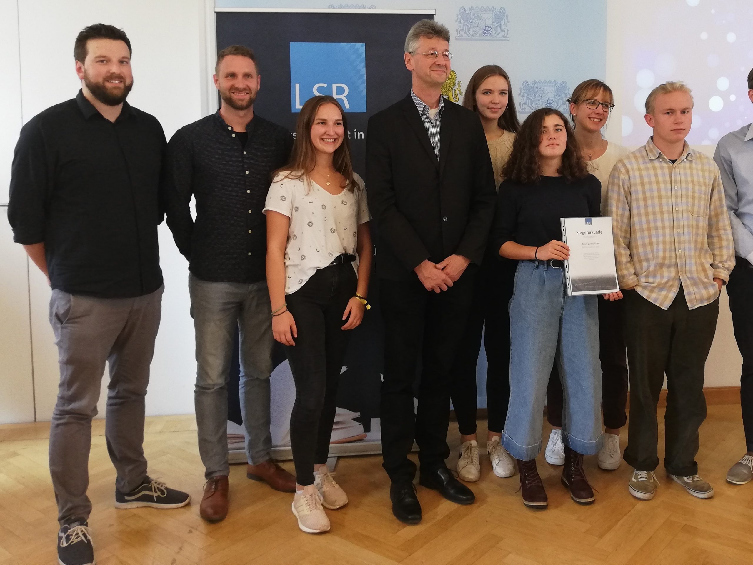 Doch nicht etwa die Wiesn ist das Ziel, sondern eine Führung durch den Bayerischen Landtag und [Trommelwirbel] eine Preisverleihung im Kultusministerium stehen auf der Tagesordnung. Doch wieso das Ganze? Vor ein paar Monaten bewarb sich unsere SMV mit dem Konzept unseres jährlichen Projekttags an dem Wettbewerb des Landesschülerrats, der das Motto „#Schulgemeinschaft – gemeinsam sind wir stärker“ trug. Auf Grund der guten Zusammenarbeit unter den Schülerinnen und Schülern an diesem Tag und der doch eher ungewöhnlichen Idee dahinter, wurde unser Rhön-Gymnasium bayernweit als eine der fünf Siegerschulen ausgewählt und zur Preisverleihung ins Kultusministerium eingeladen. Die letztjährigen Schülersprecher Anne Mäckler, Stefanie Schnellbach, Tilman Kerber sowie Lisa Klett (Schülersprecherin im Schuljahr 2017/18) und die Verbindungslehrkräfte Diana Emmert, Christian Gräb und Tobias Greubel trafen dort sowohl auf die Landesschülersprecher als auch auf Kultusminister Prof. Dr. Piazolo. Die Projekttagsidee und -organisation wurde mit 500€ prämiert. Stolz nahmen die Schülersprecher ihre Urkunde entgegen.