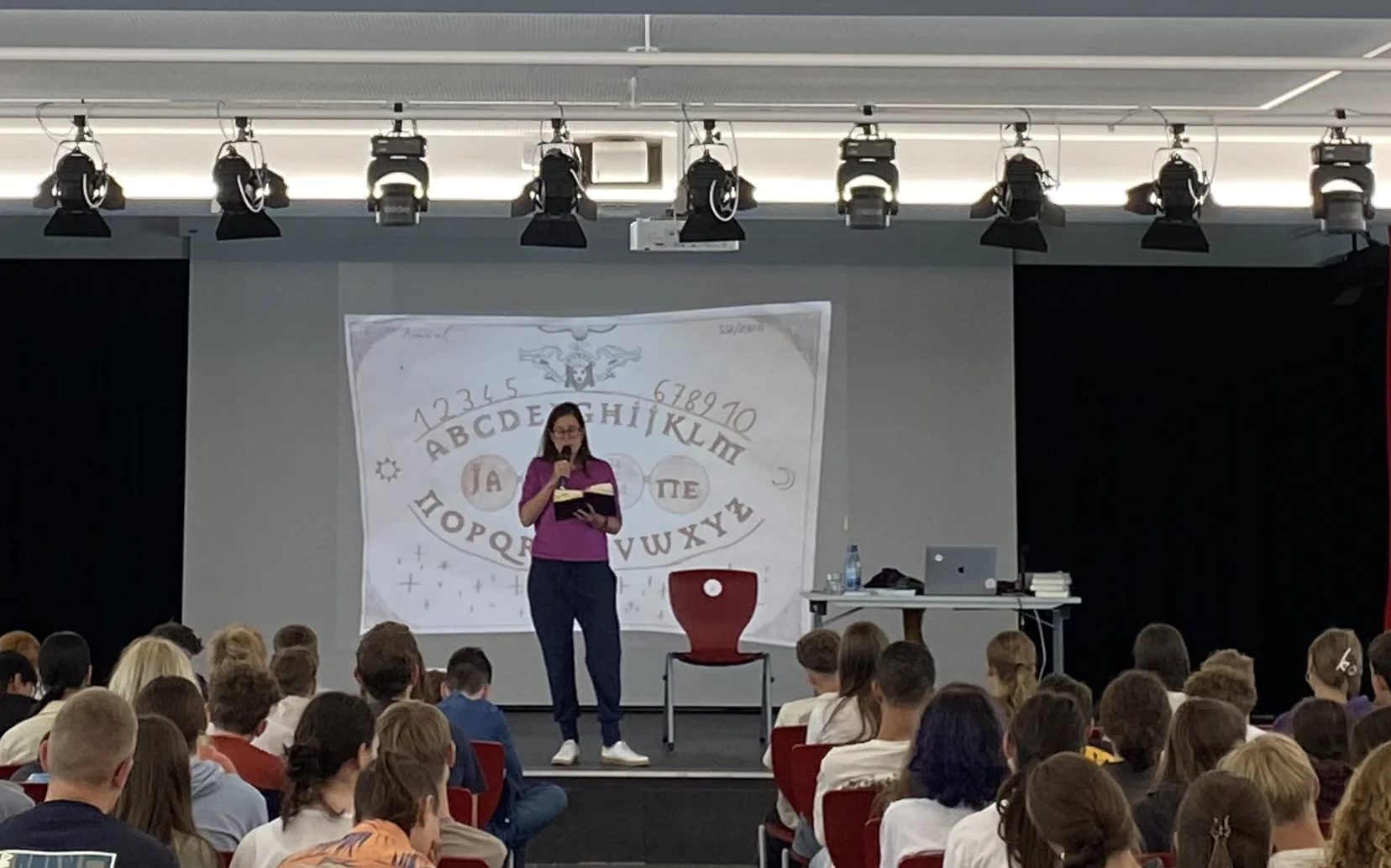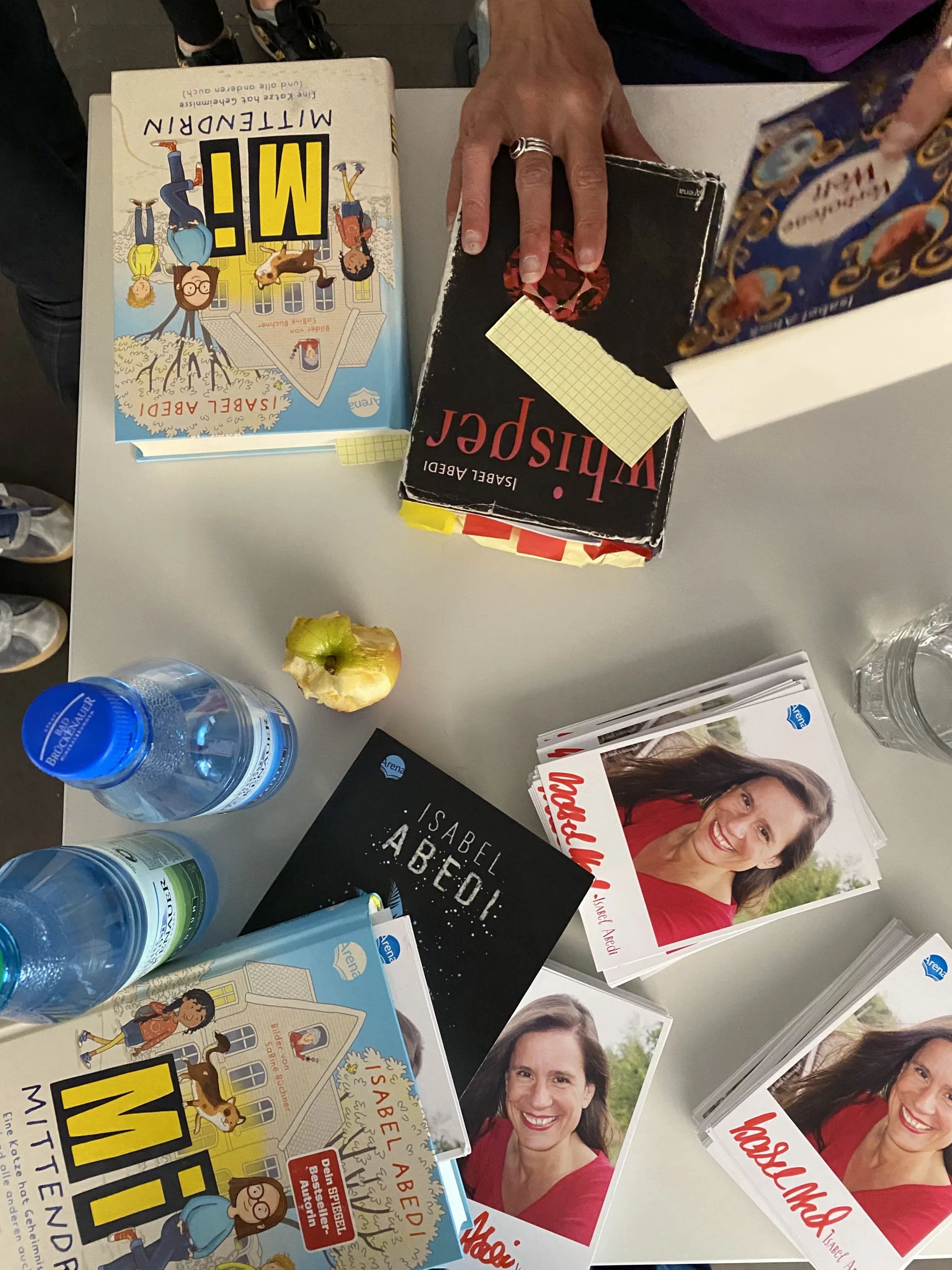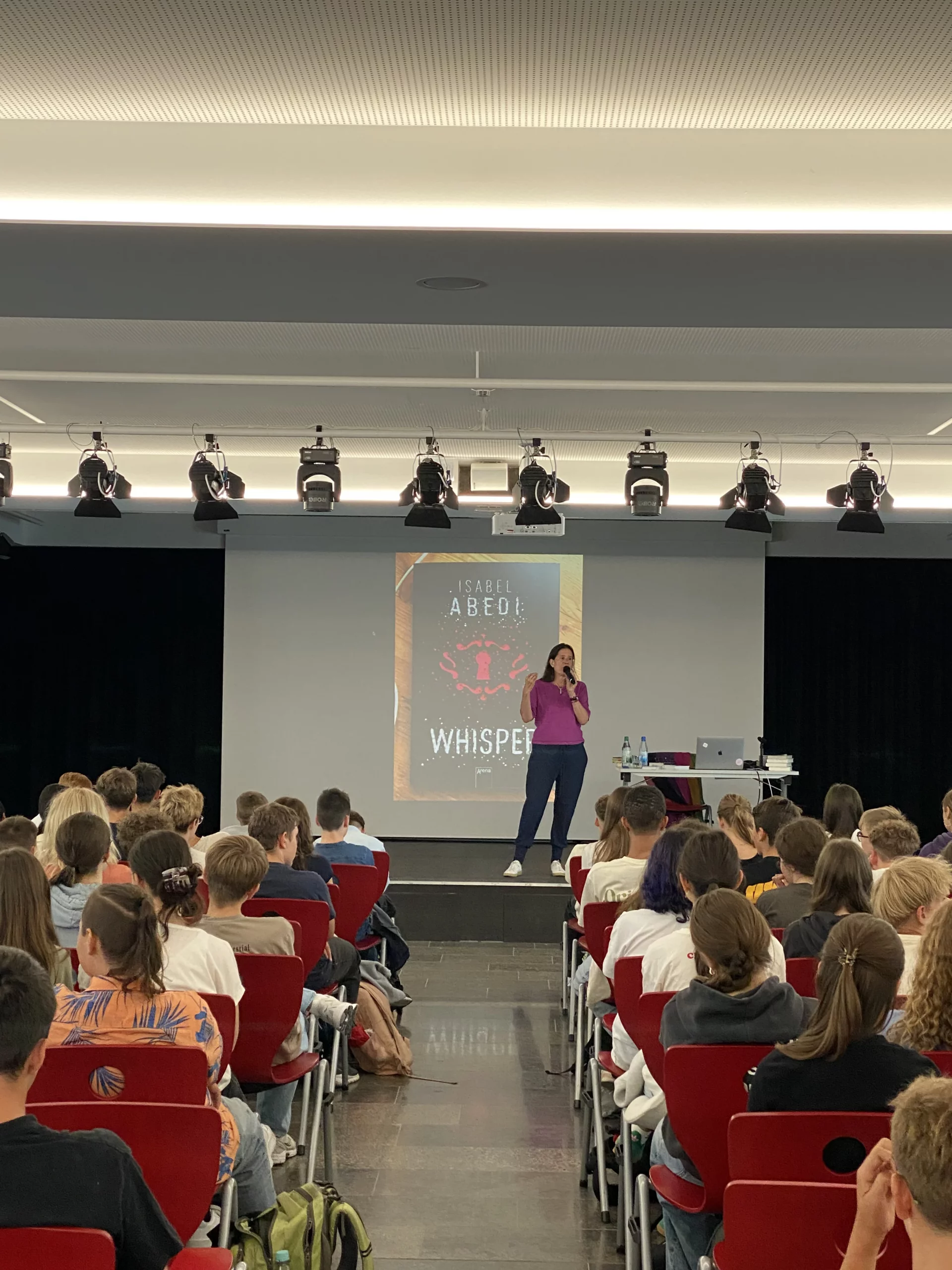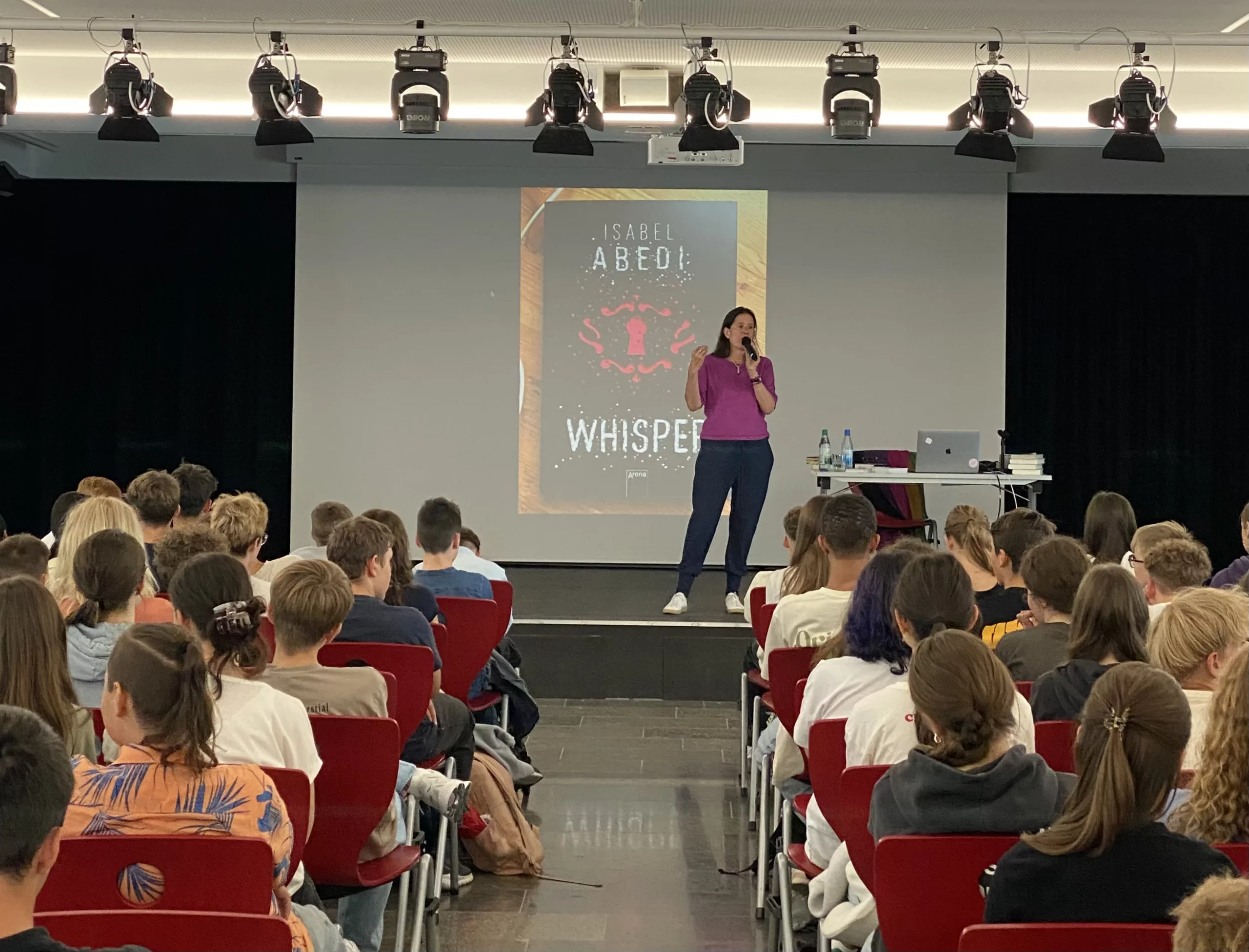 Für die Unterstufe las Isabel Abedi aus ihrem Buch „Mi mittendrin“, für die Mittelstufe aus „Whisper“. Mit ihrer lebendigen Erzählweise zog sie die Zuhörerinnen und Zuhörer in den Bann und gewährte spannende Einblicke in ihren Schreibprozess.