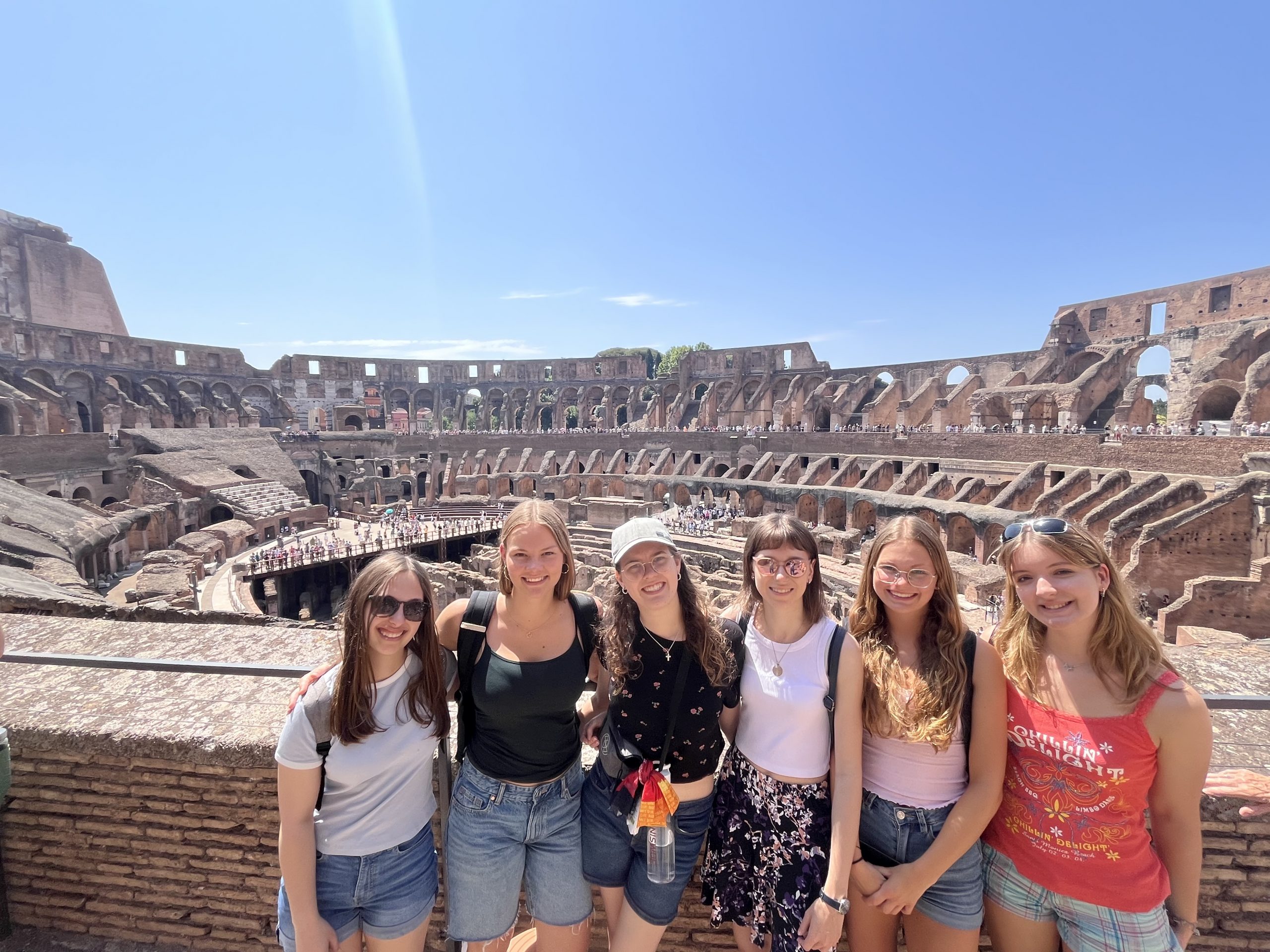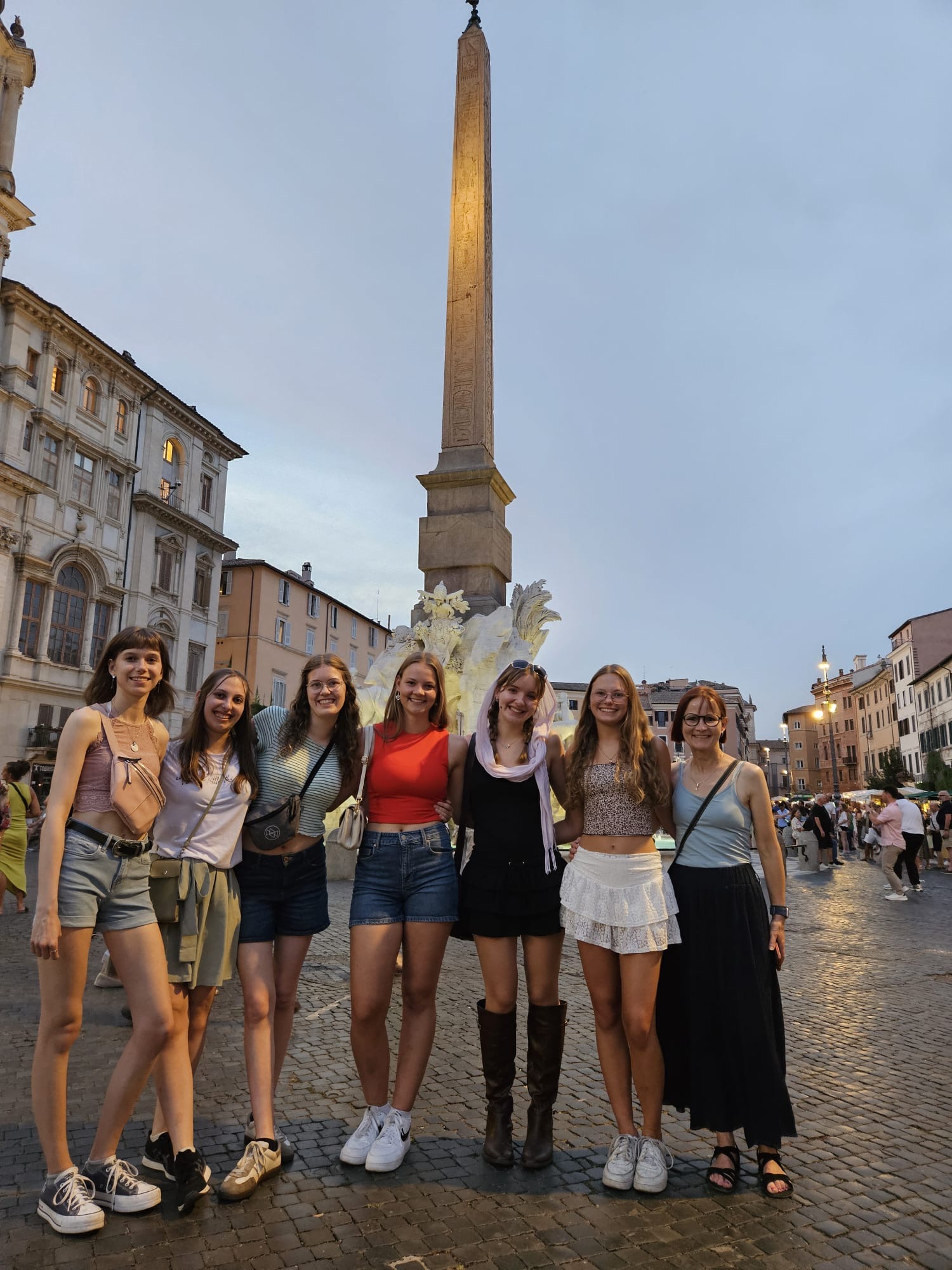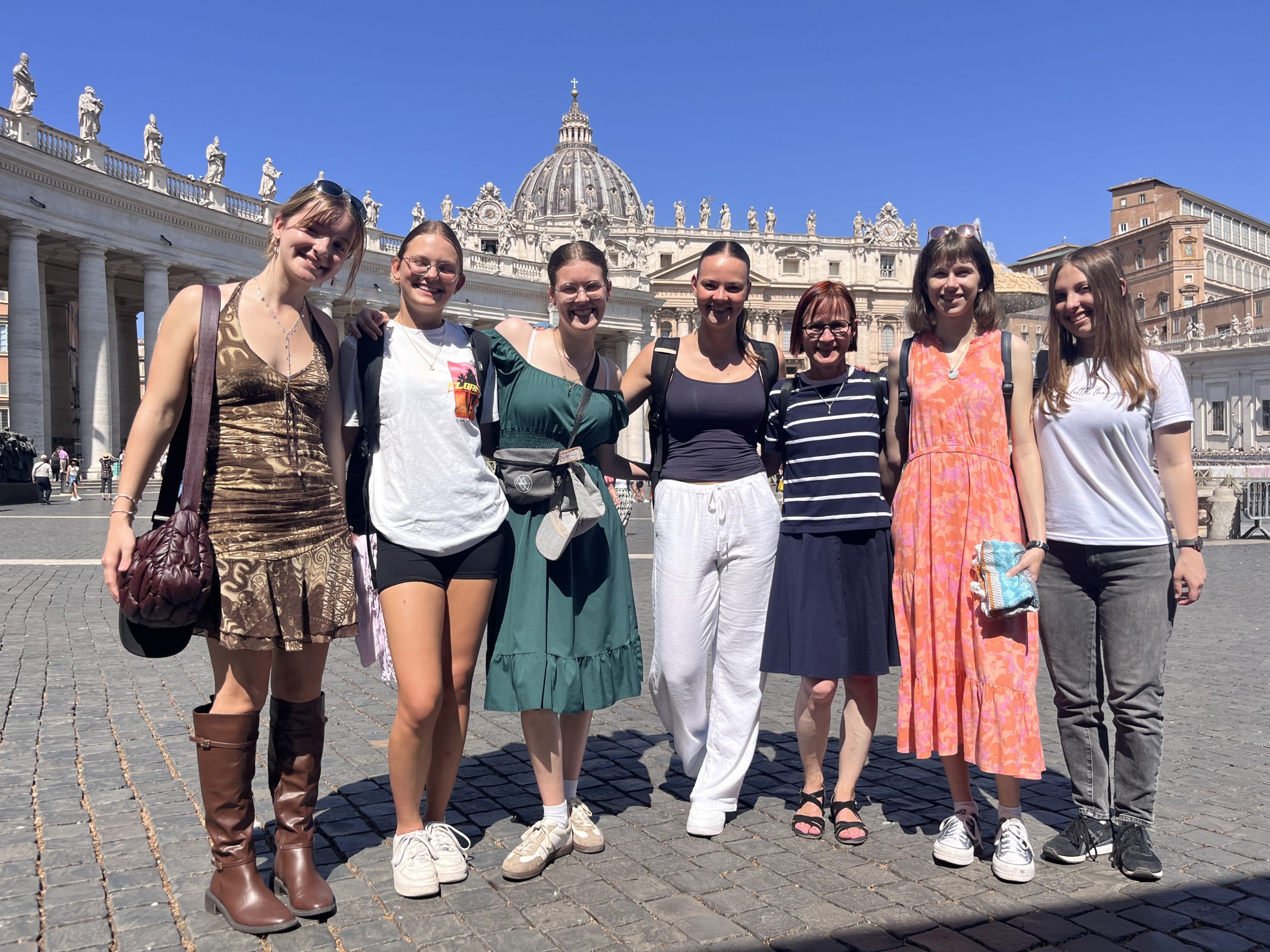 Der Oberstufenlateinkurs, bestehend aus nur sechs Schülerinnen, hatte den Wunsch, Rom nicht nur in den Schulbüchern, sondern auch mal in der Realität zu sehen. Dieser Plan wurde daraufhin in den Pfingstferien 2025 in die Tat umgesetzt: Gemeinsam mit Frau Hofer, Herrn Wirsing und Herrn Weidinger reiste die Gruppe in den Pfingstferien für sechs Tage in die „Ewige Stadt“ und bezog dort ein gemütliches Ferienhaus. Bei strahlendem Sonnenschein und sommerlichen 35 Grad erkundeten alle gemeinsam jeden Tag die antiken Orte der römischen Geschichte und sammelten unendlich viele neue Eindrücke. Ob Kolosseum, Forum Romanum oder Palatin, die kulturellen Einblicke waren vielseitig und sehr interessant.