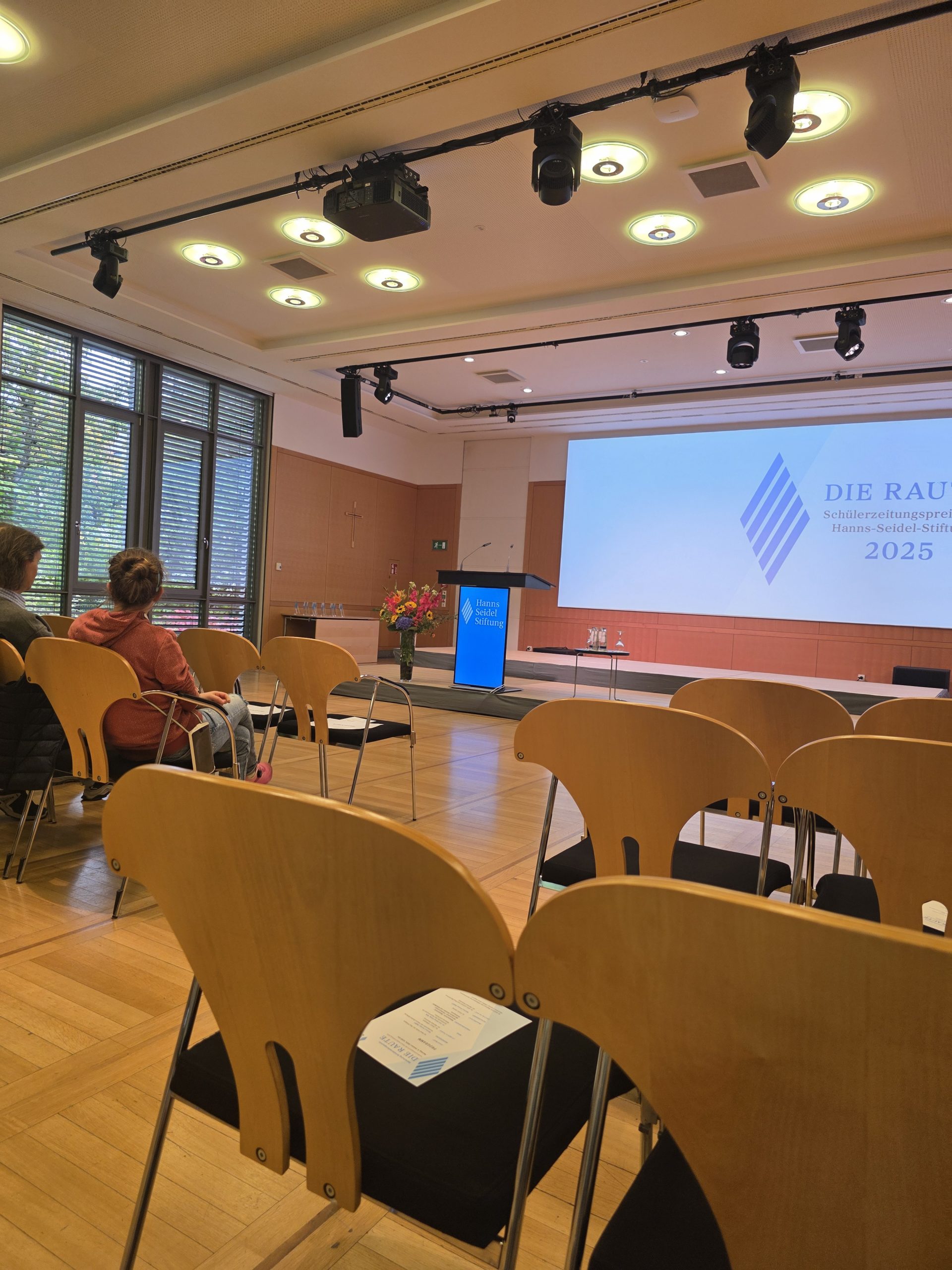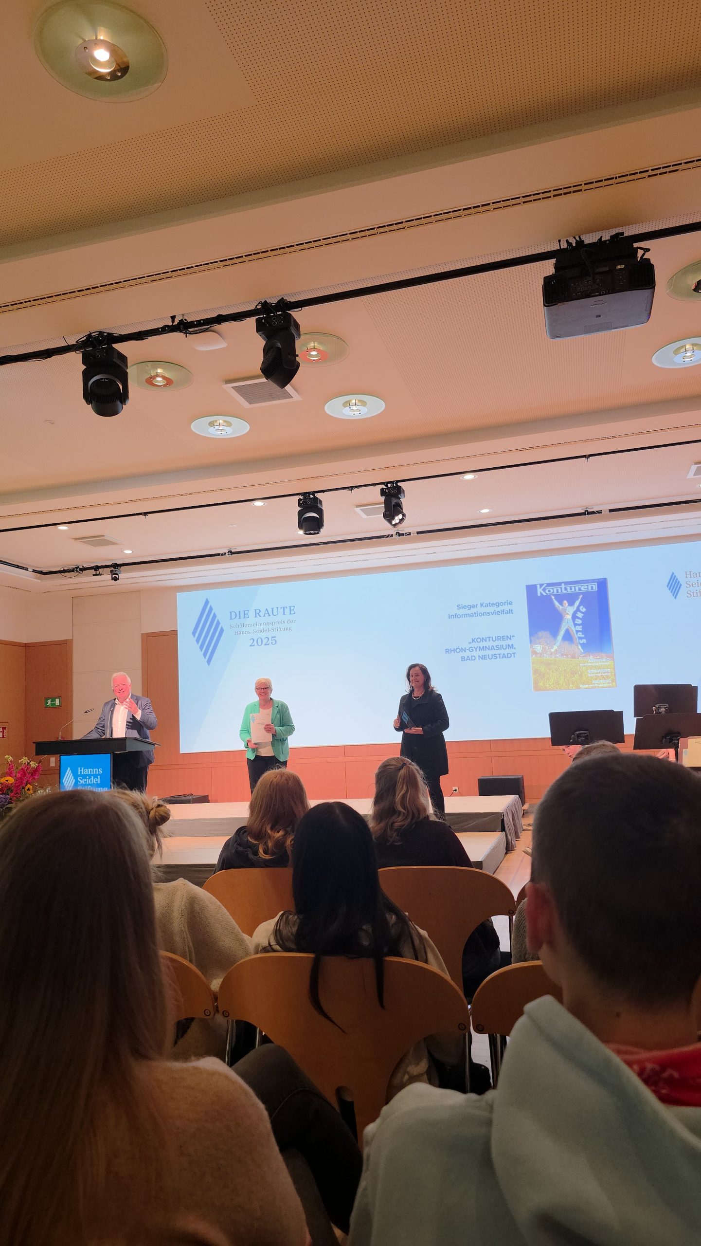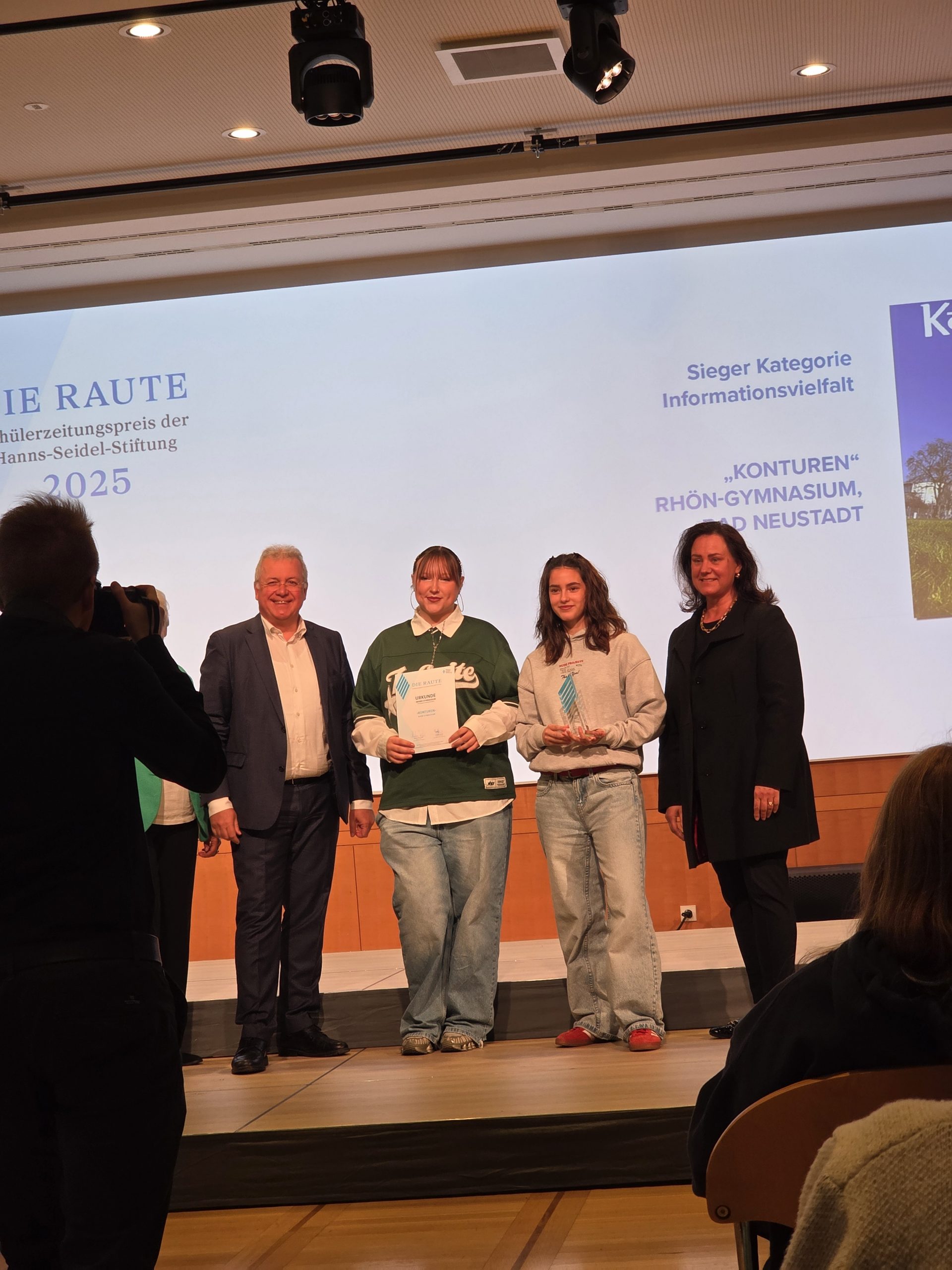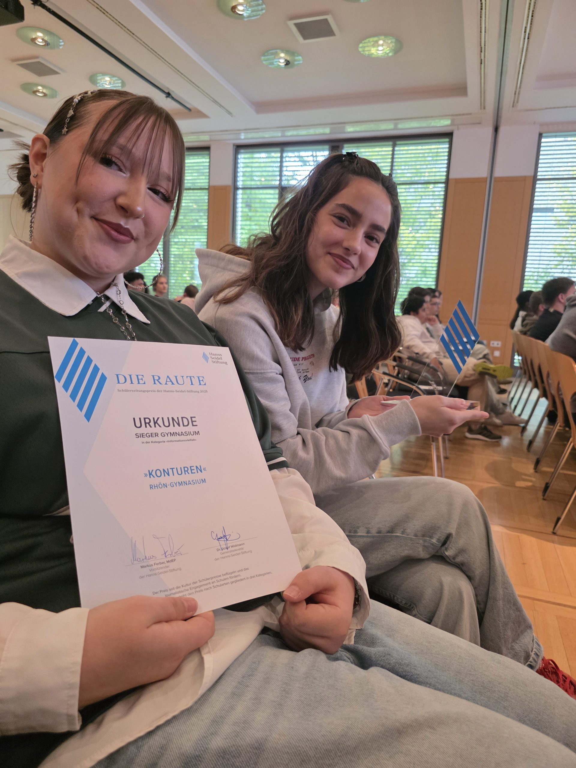 Voller Stolz nahmen Sofija Trajkovska und Ayline-Emilia Fischer als Vertreterinnen der Redaktion in München Die Raute, den Preis der Hanns-Seidel-Stiftung, in der Kategorie Informationsvielfalt entgegen. Die Jury lobte vor allem die vielfältige Auseinandersetzung mit dem Titelthema „Sprung“. Besonders positiv falle auf, dass die Redaktion stets die Zielgruppe im Blick hatte und auch schwierige Inhalte thematisierte.
