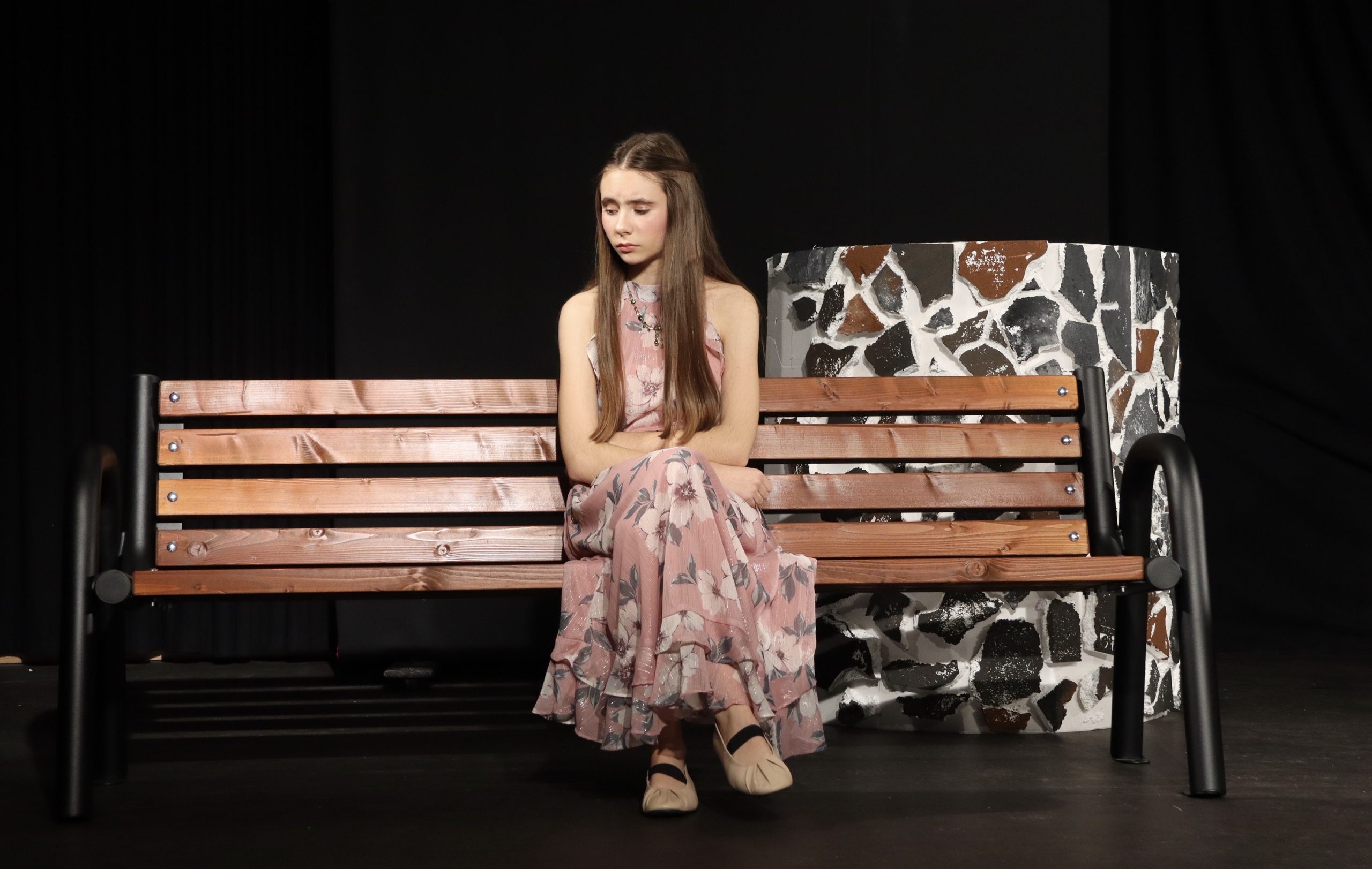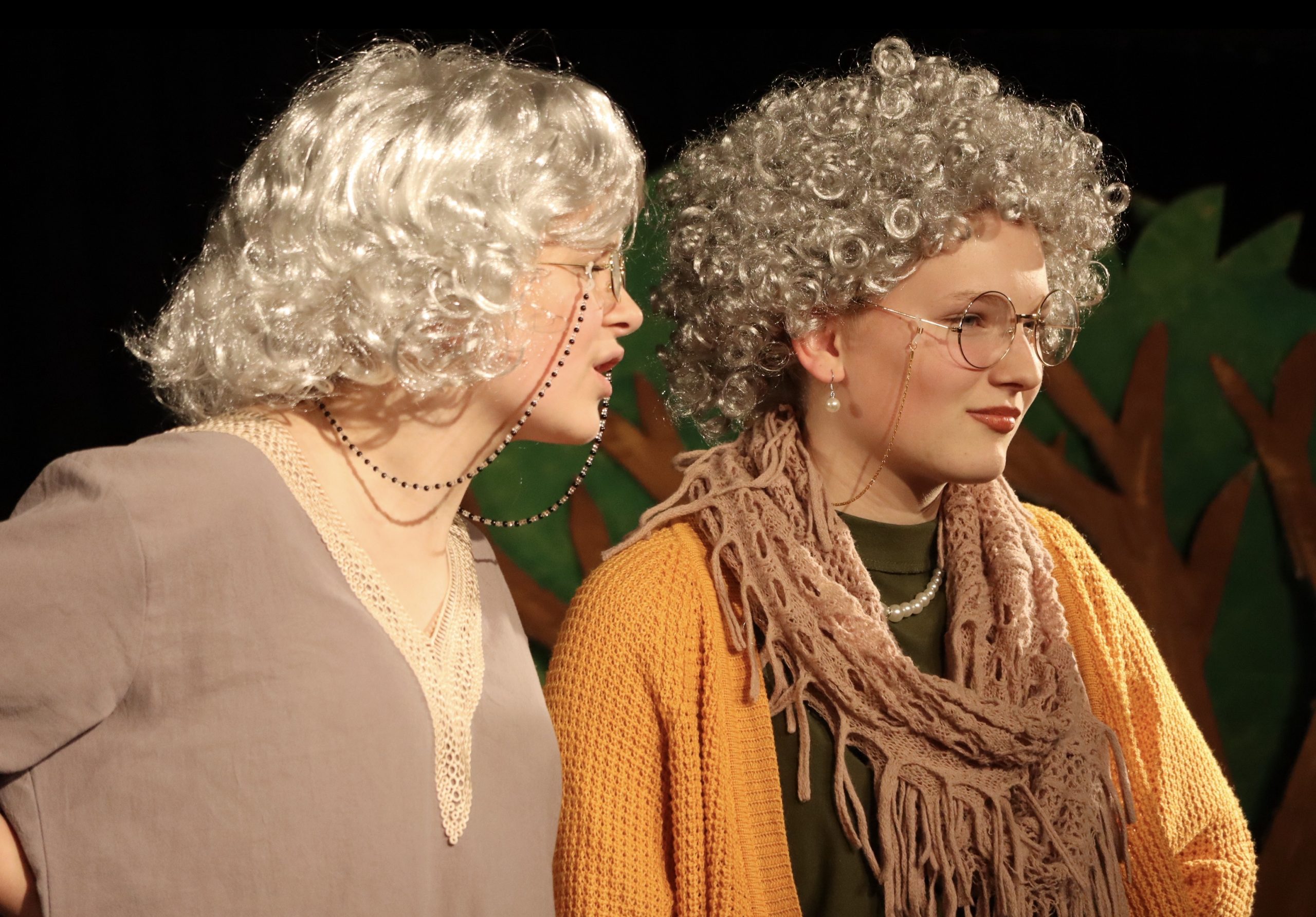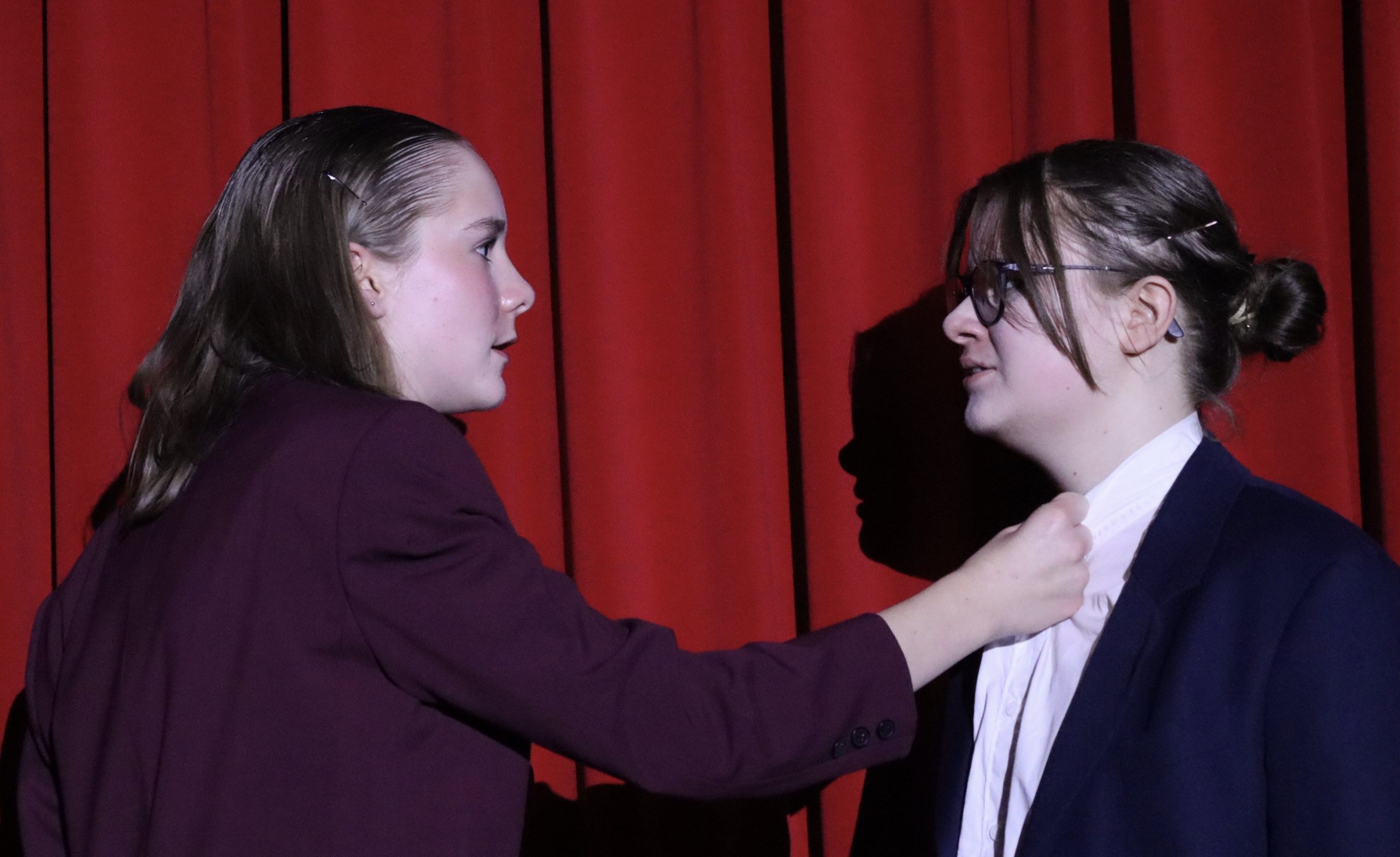 Zwei Schülerinnen treten auf und das Vorspiel auf dem Theater beginnt in einer Aula- unsere Aula.