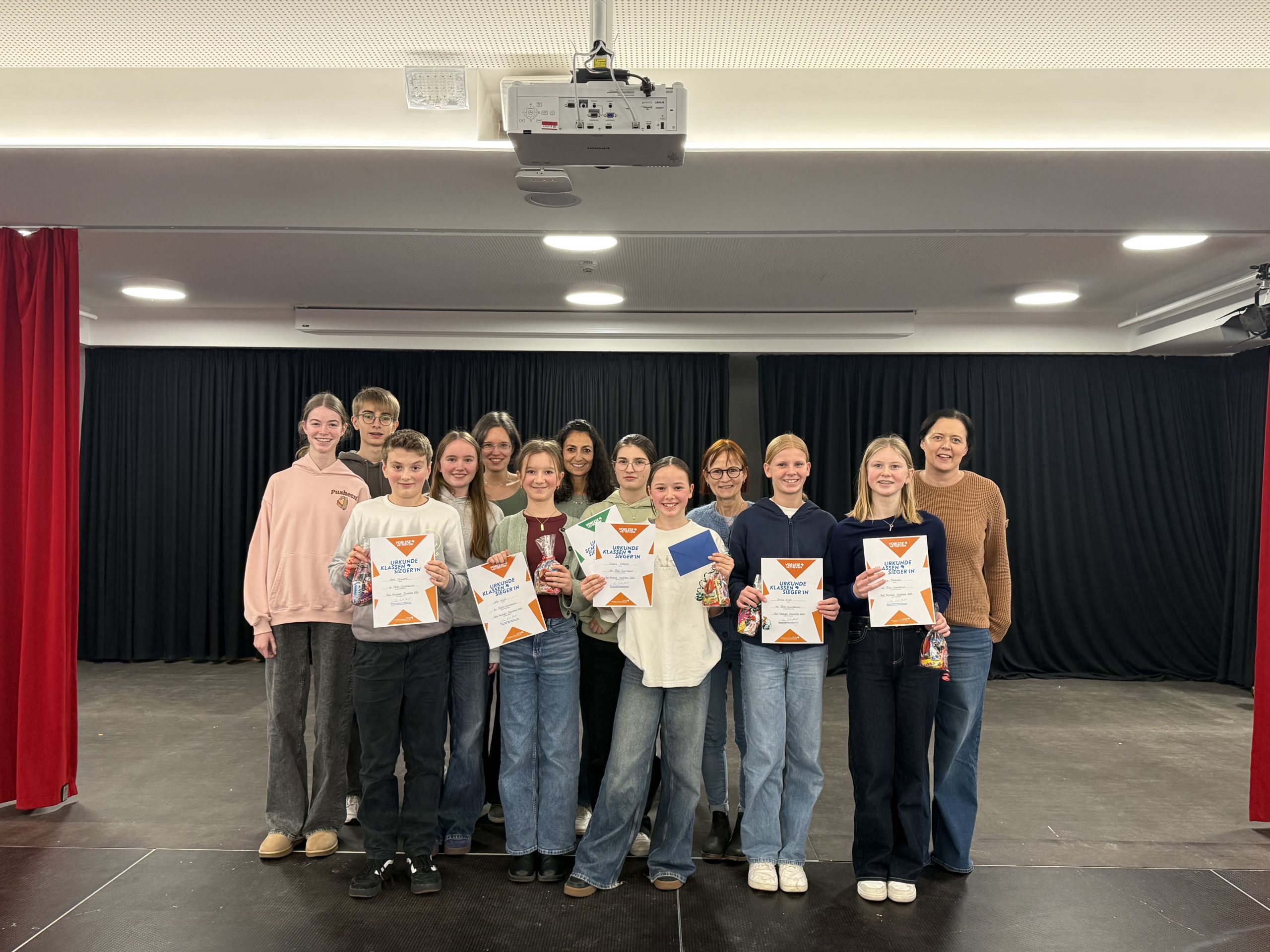 Am 4.12.2025 fand am Rhön-Gymnasium der jährliche Vorlesewettbewerb der 6. Jahrgangsstufe statt. Dabei durften die fünf Klassensieger und -siegerinnen Emil Drawert (6a), Ninelle Herbert (6b), Lotte Wülk (6c), Alissa Makowski (6d) und Emilia Groß (6e), die aus den Deutschlehrerinnen dieser Klassen und der Leitung des AK Schülerbibliothek bestehende Jury mit ihren großartigen Vorlesekünsten beeindrucken. Das grandiose Publikum bildete die gesamte 6. Jahrgangsstufe.