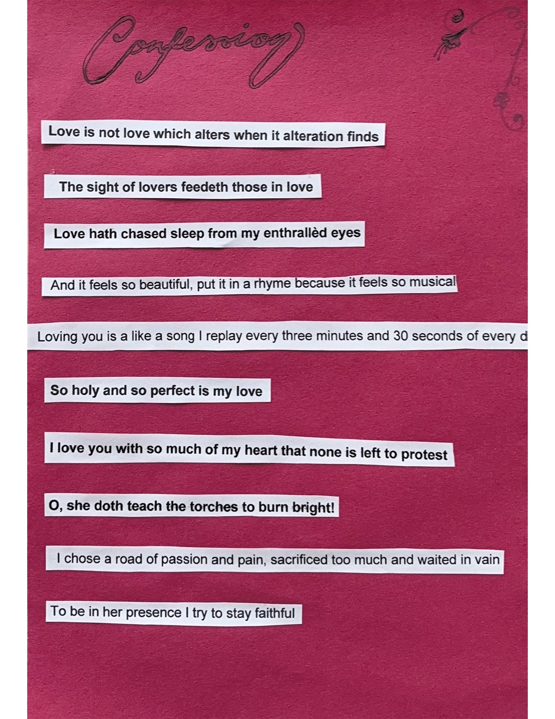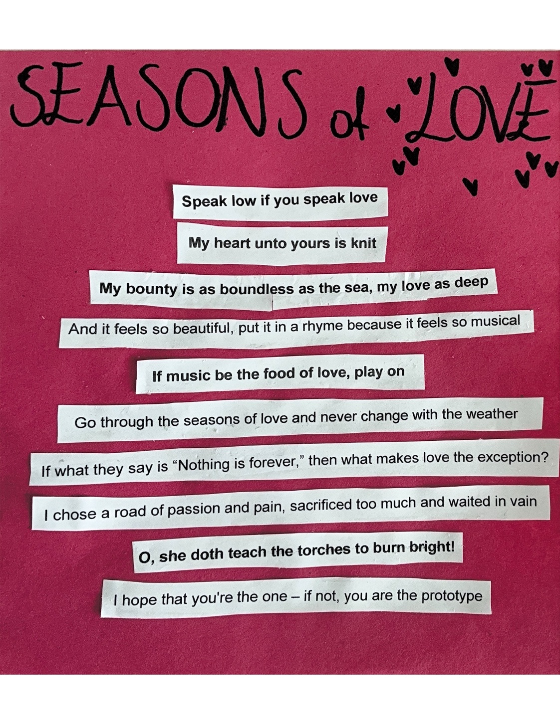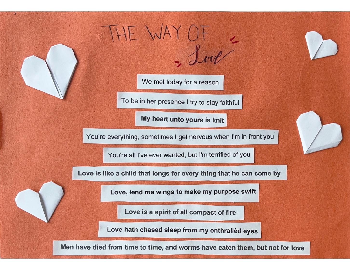 Auf den ersten Blick scheinen US-amerikanische Rapper wie Tupac Shakur und Lauryn Hill nichts mit Shakespeare gemeinsam zu haben. Das täuscht, wie Schülerinnen und Schüler des Leistungsfachs Englisch (Q13) feststellten. Im Rahmen eines kleinen Projekts setzten sie sich mit einzelnen, willkürlich ausgewählten Versen aus sowohl Shakespeares Dramen und Sonetten und als auch aus den Lyrics von Rapsongs auseinander, um aus dieser Mischung neue Liebeslyrik zu generieren. Aufgabe war es, zehn zufällig gezogene Verse sinnvoll anzuordnen und ihrem Gedicht eine neue Überschrift zu geben, um anschließend ihre eigenen Texte zu präsentieren und zu deuten. Dabei stellte sich heraus, dass Rap-Lyrics und Shakespeares Verse wunderbar zusammenpassen und neue Kunstwerke entstehen lassen: Schließlich sind Shakespeare und zum Beispiel Tupac wahre Sprachkünstler, die ihren Zeilen durch Musikalität Leben einhauchen.