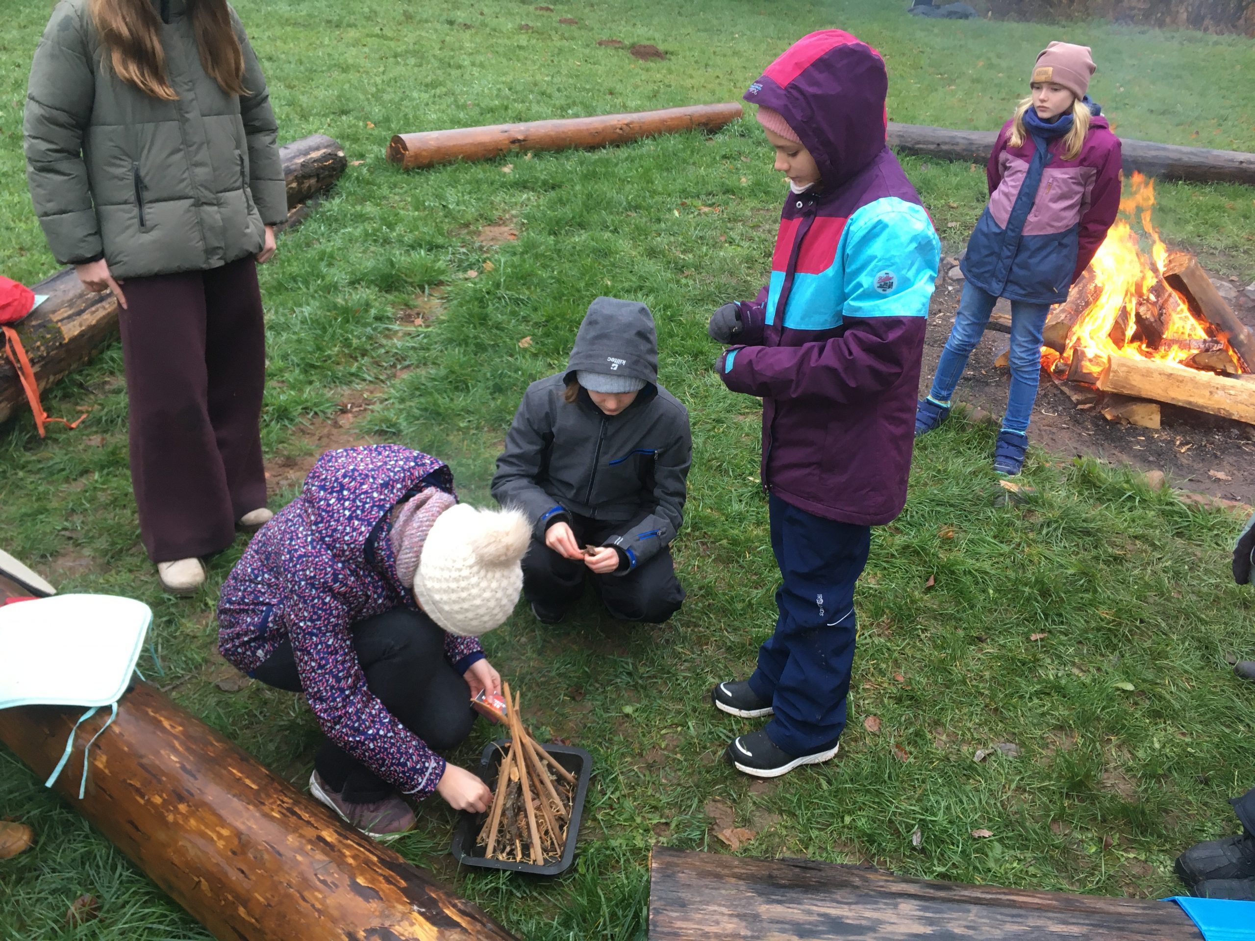 Der zweite Termin fand in Schönau an der Brend statt. Hier lernten wir die verschiedenen Holzarten und deren Eigenschaften kennen. Diese konnten wir beim Löffelbrennen und Schnitzen gleich praktisch erproben. Vorher mussten wir aber erstmal üben, wie man möglichst geschickt Feuer macht.