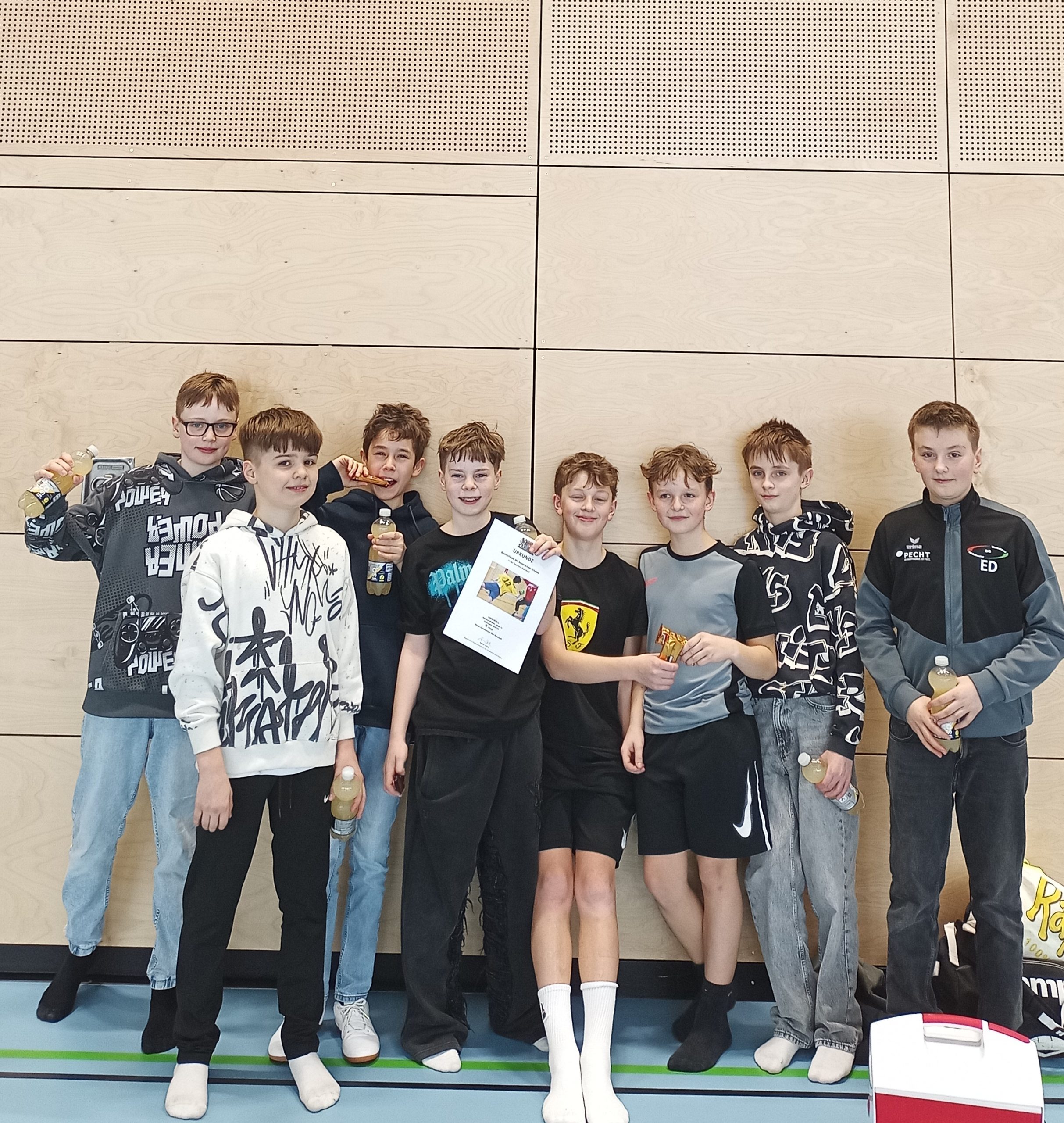 Beim Bezirksfinale am 2.2.2026 in Kitzingen konnten unsere Handball-Jungs gegen die überlegenen Mannschaften des Deutschhaus-Gymnasiums aus Würzburg, des Egbert-Gymnasiums aus Münsterschwarzach und des Friedrich-Dessauer-Gymnasiums aus Aschaffenburg zwar keinen Podiumsplatz erspielen, repräsentierten das Rhön-Gymnasium aber mit Fairness, sportlichem Ehrgeiz und Teamgeist! Wenn man berücksichtigt, dass in unserer Schulmannschaft neben erfahrenen Vereinsspielern auch Teilnehmer der Handball-Schul-AG von Herrn Poblotzki allererste Turniererfahrungen sammeln durften, ist das insgesamt eine tolle Leistung. Betreut wurde die Mannschaft während des Turniers unter anderem von Elin Ziegler aus der 11a. Auf dem Spielfeld standen an diesem Tag Emil Drawert, Laurenz Fritzsche, Diego Gerhardt, Mats Grebe, Bastian Hochgesang, Jonathan König, Emil Mölter, Noah Scheidler, Marlon Schwitale und Max Trost – bleibt am Ball, Jungs!