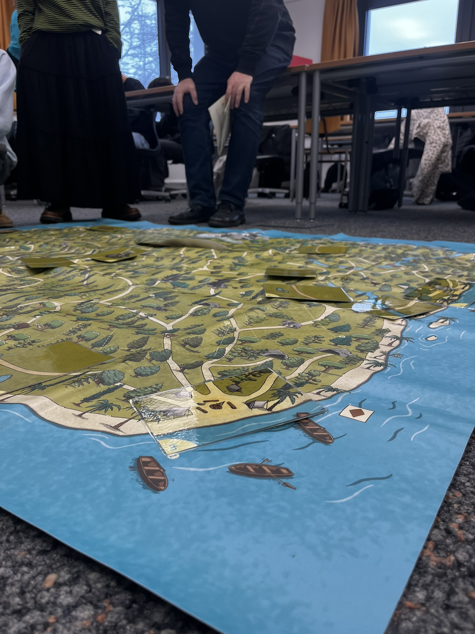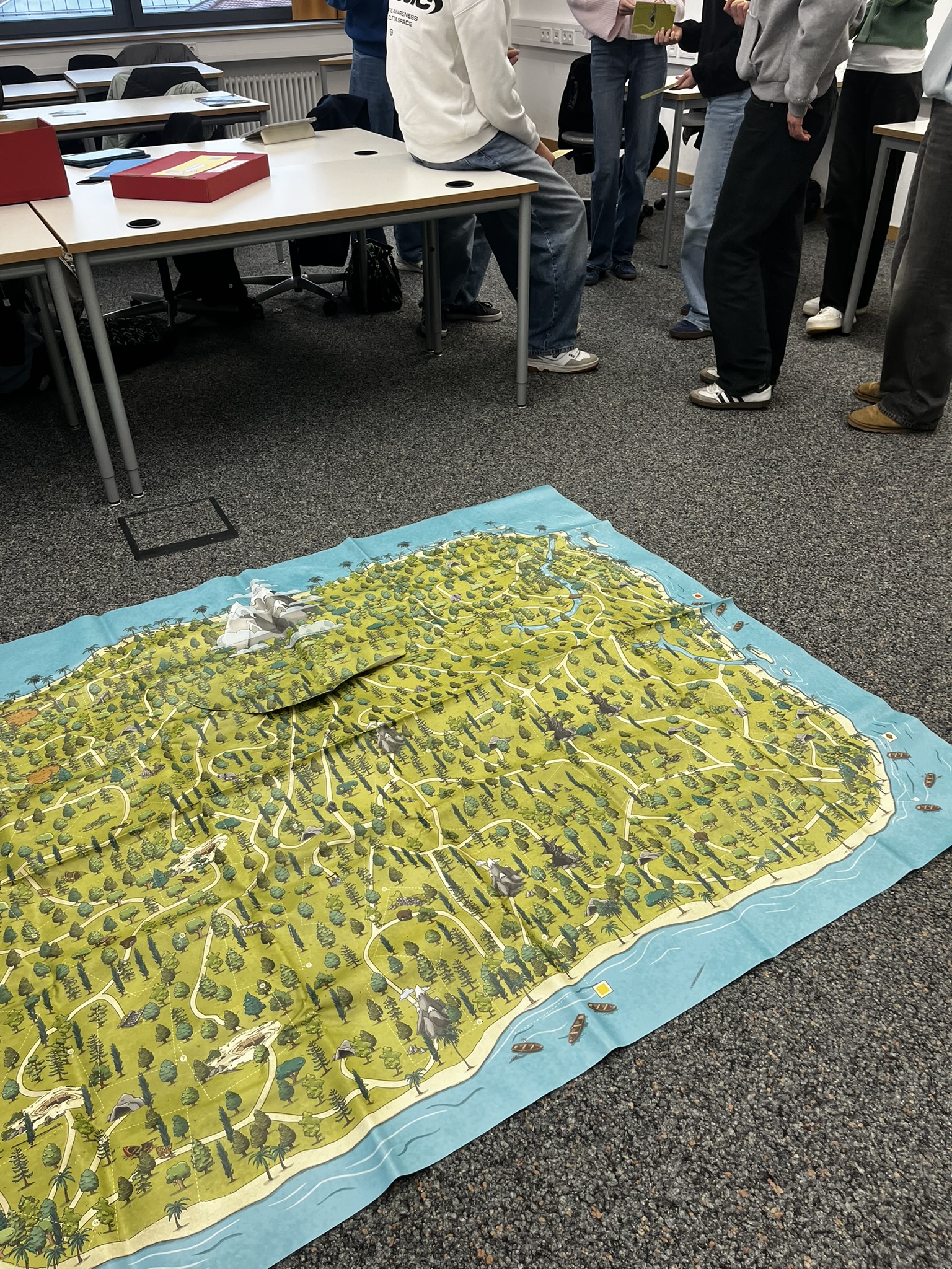 Die Schülerinnen und Schüler mussten sich spielerisch mit Menschenrechten und Bedürfnissen auseinandersetzen, Rätsel lösen, um auf unterschiedlichen Pfaden gemeinsam einen zentralen Platz auf einer großen Inselkarte erreichen und dabei zentrale Fragen klären: