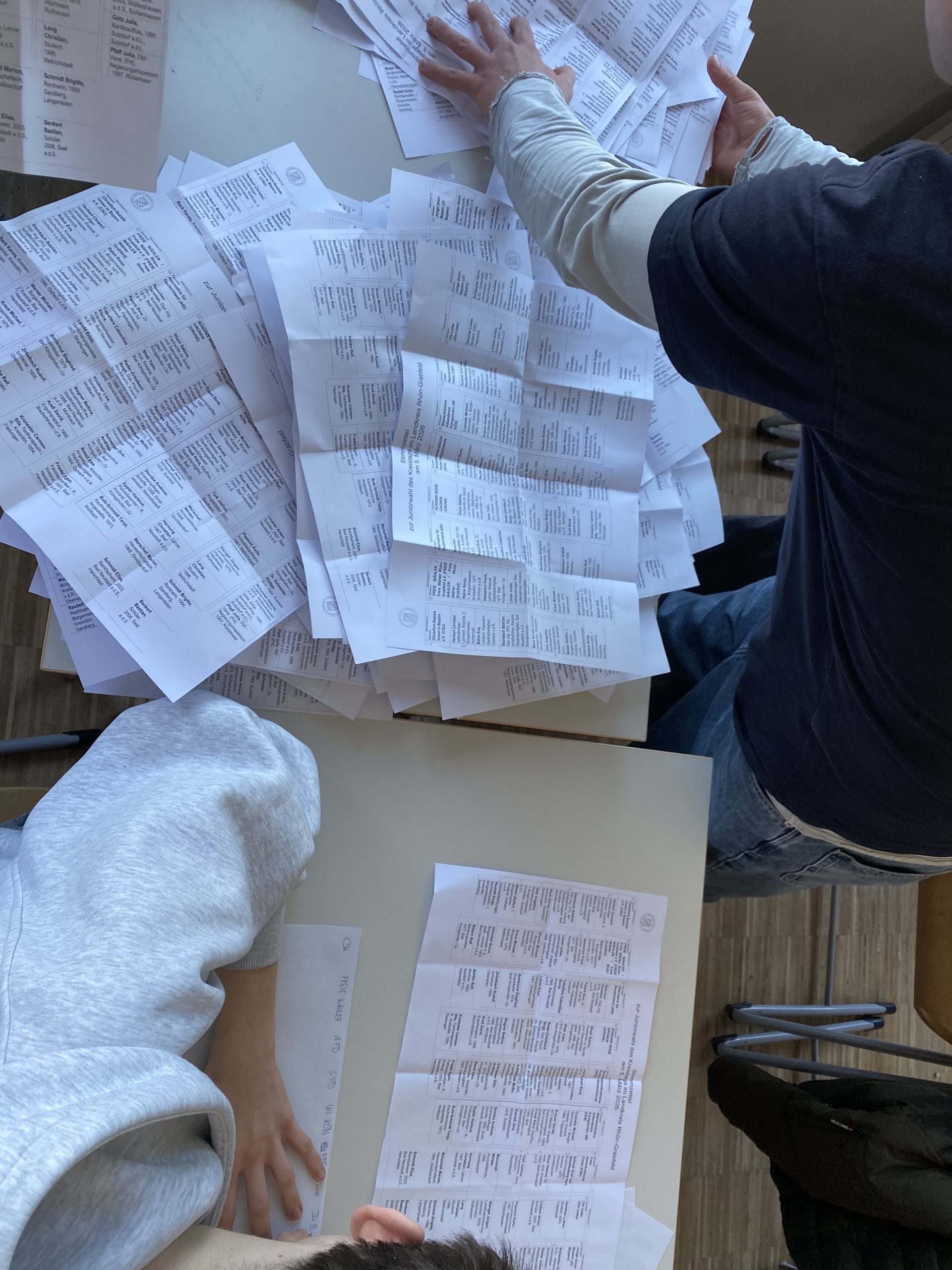 Um den Ablauf übersichtlich zu halten, erhielten die Jugendlichen für die Kreistagswahl einen etwas verkleinerten Stimmzettel, der jedoch alle Parteien enthielt. Insgesamt standen ihnen dort 21 Stimmen zur Verfügung. Wie bei den realen Wahlen konnten sie das Listenkreuz setzen, panaschieren, kumulieren oder einzelne Kandidaten streichen und so ihre Stimmen individuell verteilen.