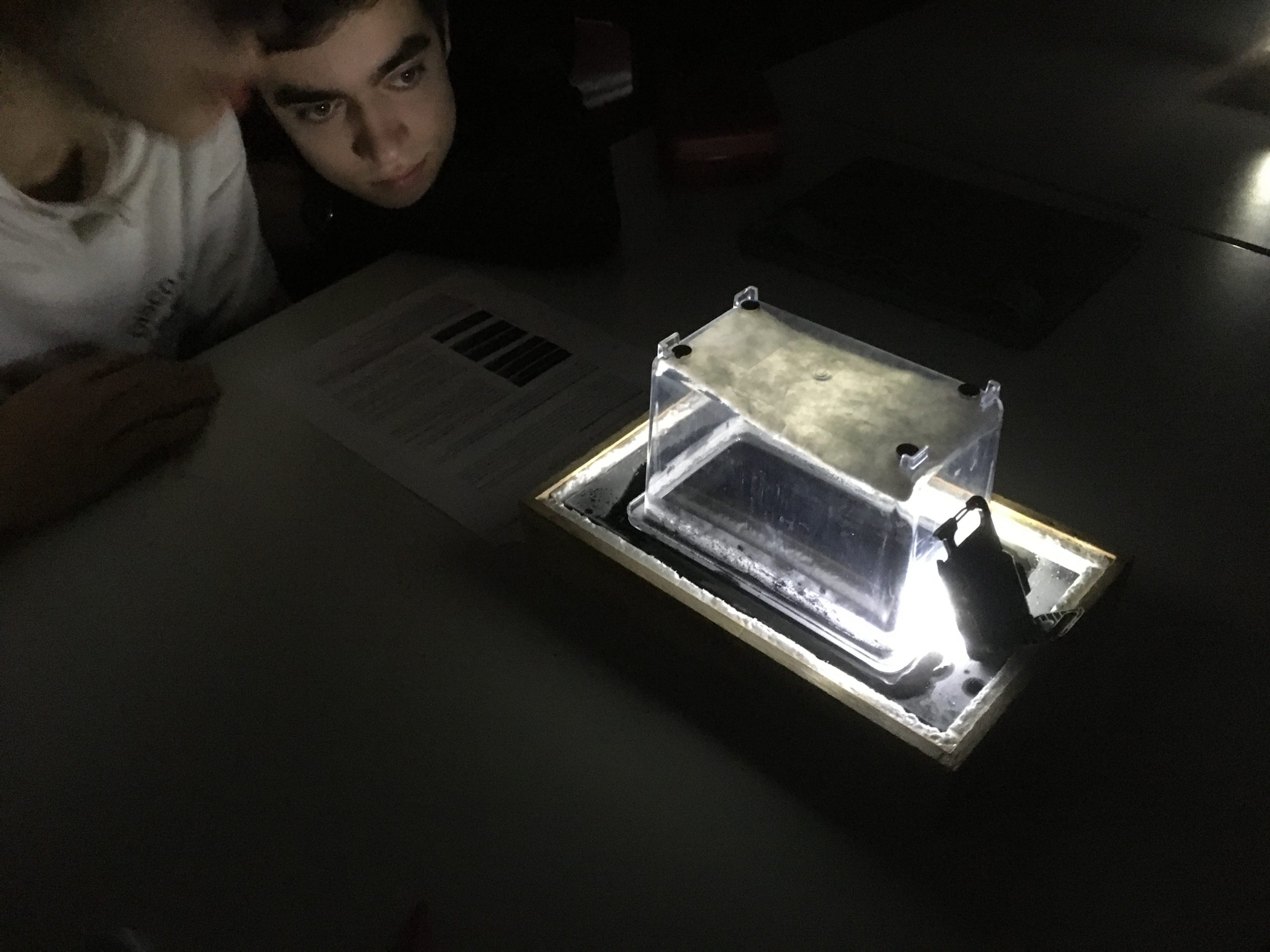 Im ersten Block des Vormittags bauten die Schülerinnen und Schüler eine Nebelkammer auf, mit der man die Teilchenspuren der natürlichen Radioaktivität beobachten konnte. Das Hantieren mit Trockeneis war dabei ungewohnt, aber interessant.