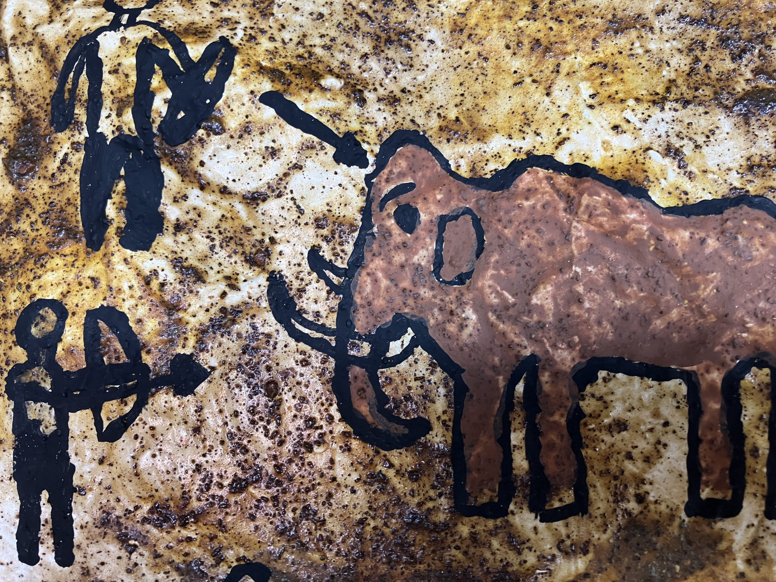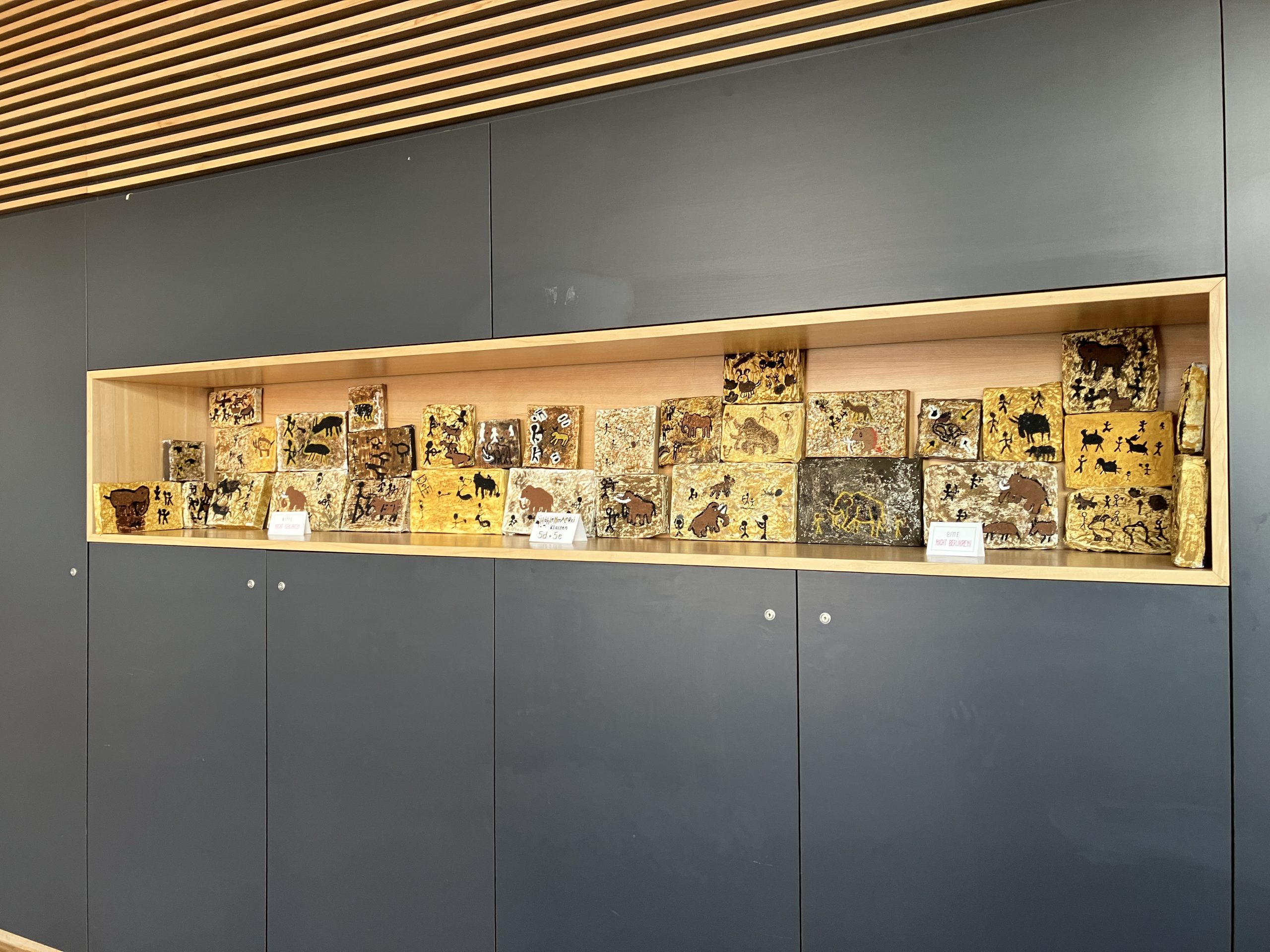 Im praktischen Teil fertigten die Kinder eigene Höhlenwände aus Pappmaché an. Diese wurden mithilfe von Gewürzen und Kleister so gestaltet, dass eine möglichst realistische Farbigkeit und Oberflächenstruktur entstanden. Ein besonderer Schwerpunkt lag auf der Herstellung von Farben aus Naturmaterialien, wodurch ein anschaulicher Bezug zu historischen Arbeitsweisen geschaffen wurde. Auf den selbst gestalteten Untergründen entwickelten die Schülerinnen und Schüler eigene Höhlenzeichnungen, die sich an prähistorischen Motiven orientierten.