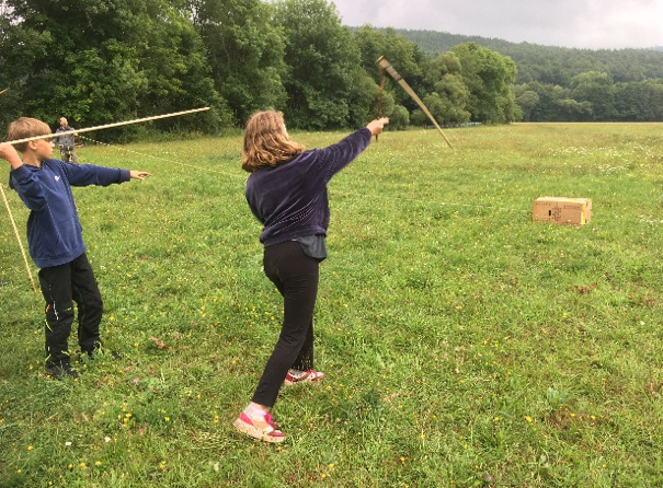 Aus unserem ganzjährigen Wahlkurs „Draußen Zuhause“ und anderen Wildnis Aktionen ist seit 2023 das Zeltlager am Ende des Schuljahres entstanden. Mit den Kindern, die sich für den Wahlkurs angemeldet haben und vorzugsweise aus unseren FuE Klassen, verbringen wir 5 Tage auf einer Wiese in Schönau an der Brend unweit von Wald und Bach. Während dieser Tage haben wir genügend Zeit um auch längere Projekte durchzuführen. Beispielsweise das Flechten von Brennnesselschnüren, Löffelbrennen, Schnitzen oder der Bau einer Speerschleuder gehören dazu. Im Zeltlager leben wir als kleine Gemeinschaft, in der die Kinder auch eigene Aufgaben zu erfüllen haben. Dazu gehören das morgendliche Feuermachen oder das Helfen beim Herrichten des Frühstücksbuffets oder beim Abendessenkochen.
